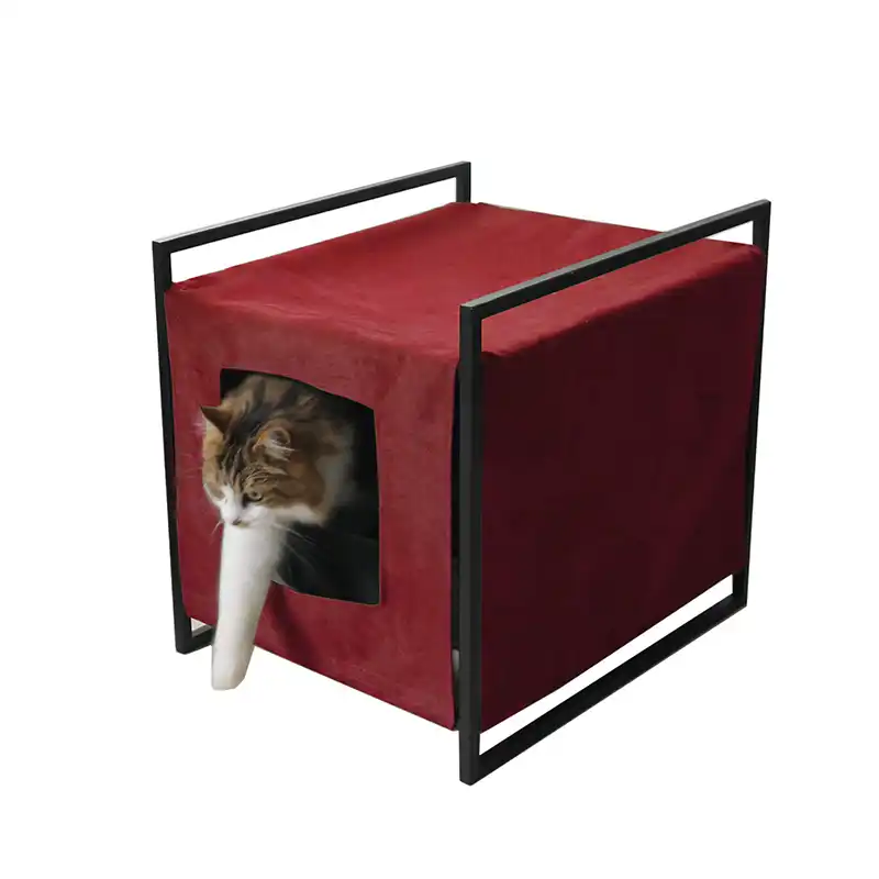UN BACÀ LITIÈRE DESIGN : Avec son style élégant, cette belle Maison de toilette Homycat trouvera sa place dans votre intérieur sans difficulté. Vous cherchez un cache bac à litière dans les tons rouge, griottes ou bordeaux pour se fondre dans votre déco ? Cette maison de toilette à la parure réversible vous laissera la possibilité de passer du bordeaux plus foncé au griotte plus clair selon vos envies et selon votre déco. Cette litière design inspirée du style industriel avec sa structure en métal noir indestructible, apportera du cachet à votre déco. Disponible en d'autres coloris, ici