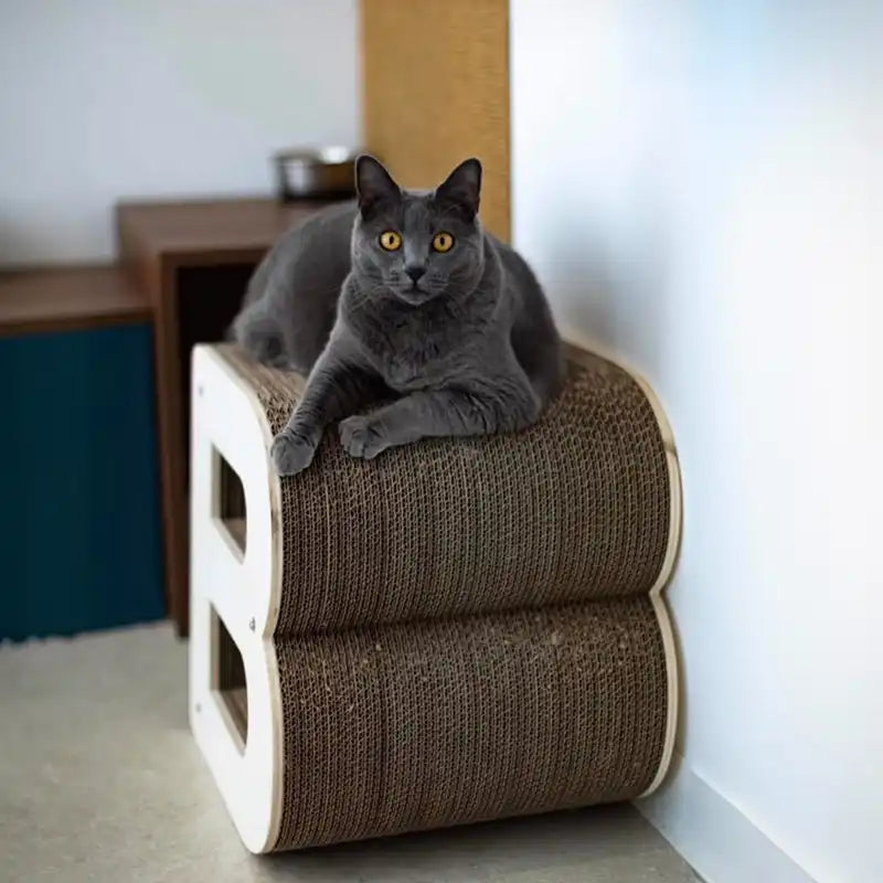 MATÉRIAUX FRANÇAIS DE QUALITÉ :carton dense qui fait beaucoup moins de "miettes" que les griffoirs en carton traditionnels ; façades en bois pour une meilleure structure