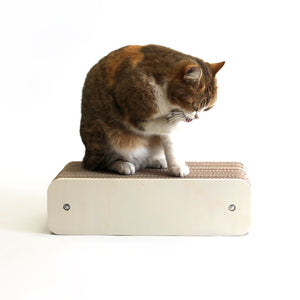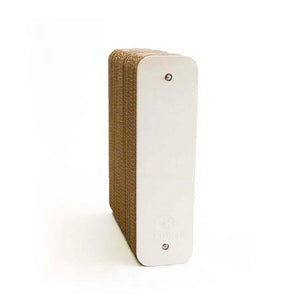 En plus de la forme originale du griffoir, les faces en bois de peuplier renforcent l'aspect esthétique du mobilier et aident le système de quincaillerie à maintenir les plaques de cartons ensemble. Ce nouveau modèle d'assemblage permet de remplacer le carton quand celui-ci est usé par les griffes du chat. Vous pouvez accéder aux recharges en carton en cliquant ici.