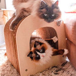 MATÉRIAUX FRANÇAIS DE QUALITÉ :carton dense qui fait beaucoup moins de "miettes" que les griffoirs en carton traditionnels ; façades en bois pour une meilleure structure