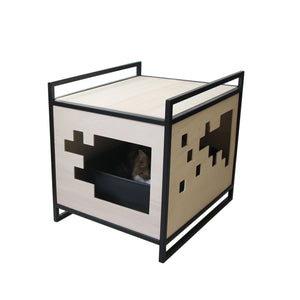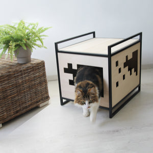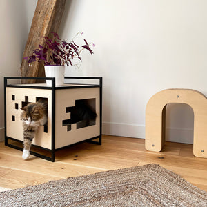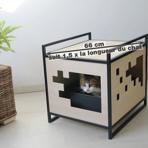 UN BACÀ LITIÈRE DESIGN : Fini les nombreuses heures à se demander quelle sera la place attribuée à la litière au sein de la pièce avec cette belle Maison de toilette Homycat. Les parois de bois ajourées par un motif mosaïque très tendance, habillera votre intérieur avec style et élégance. C'est un système d'assemblage (non aimanté) qui permet la modularité. Cette litière design avec sa structure métallique noire style industriel et son habillage en bois apportera du cachet à votre univers déco.