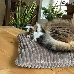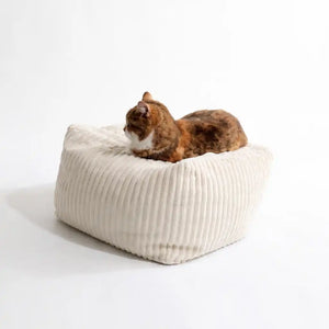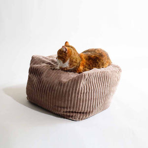 Le confort et le design réunis pour votre chat : découvrez notre collection de couchages en velours côtelé taupe et Ecru !